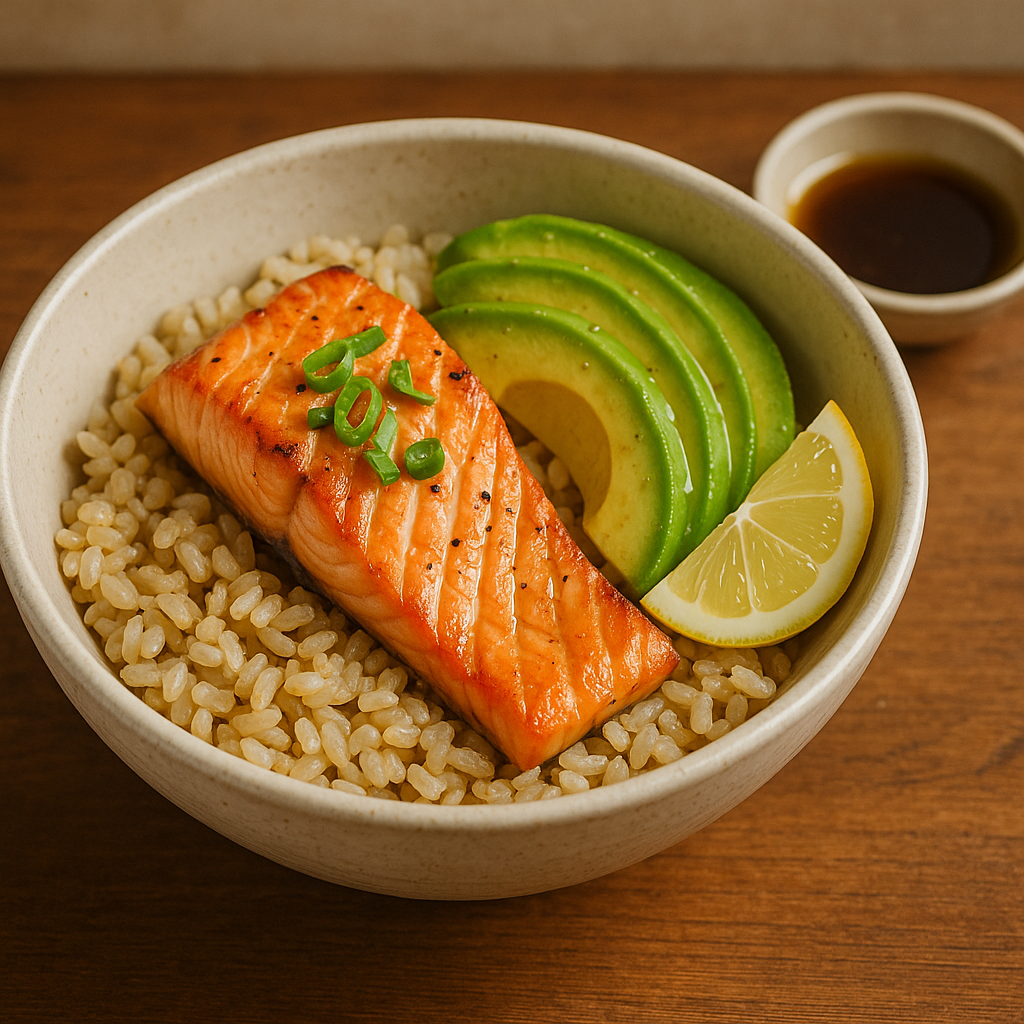 • 재료: 구운 연어 100g, 아보카도 1/2개, 현미밥 1공기, 간장·레몬즙 소량