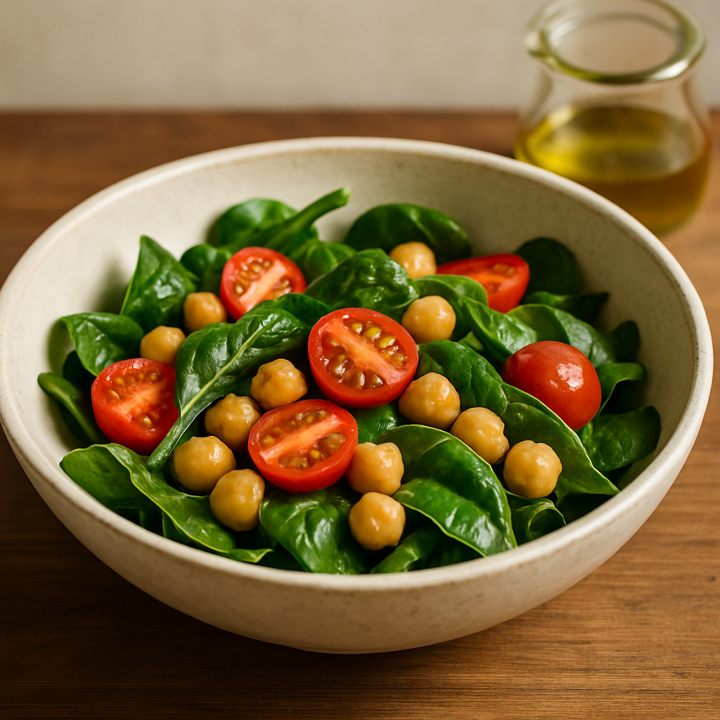 • 재료: 시금치 한 줌, 병아리콩 1/2컵, 방울토마토 5개, 올리브오일·레몬즙·후추